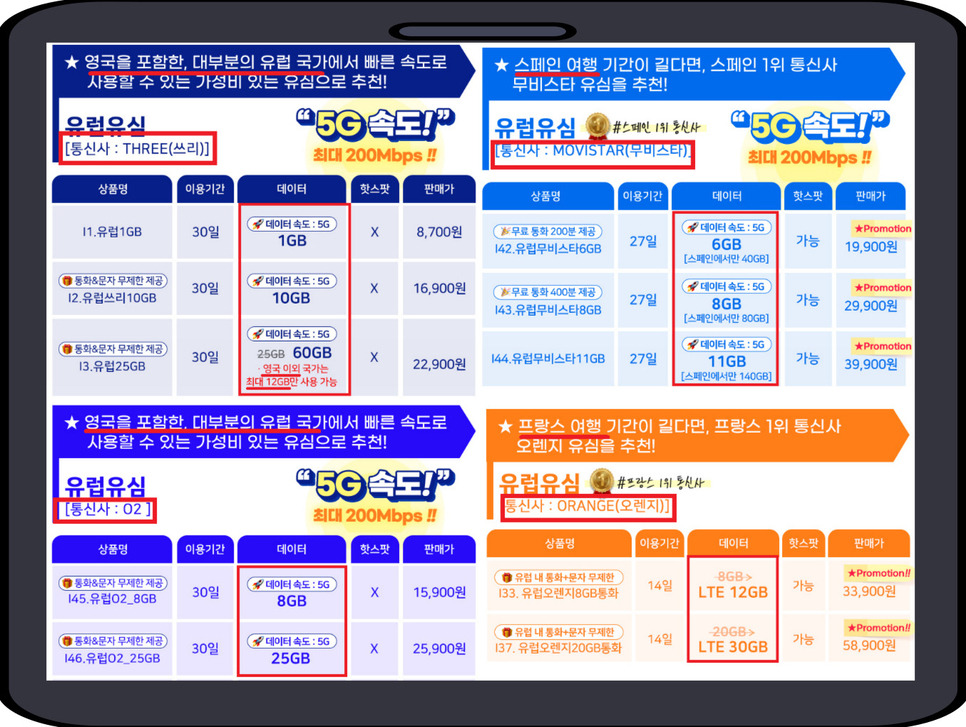 다양한 서비스 제공자들이 5G 속도를 강조하고 있으며, 최대 200 Mbps의 속도를 제공하는 요금제도 있습니다. 여행 중에도 원활한 인터넷 사용이 가능하다는 점이 큰 장점입니다.