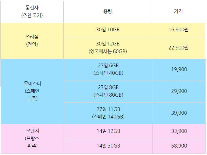 위의 표를 보면, 데이터 용량과 가격이 다양하게 제공되고 있음을 알 수 있습니다. 여행 기간에 맞춰 적절한 요금제를 선택하는 것이 중요합니다.